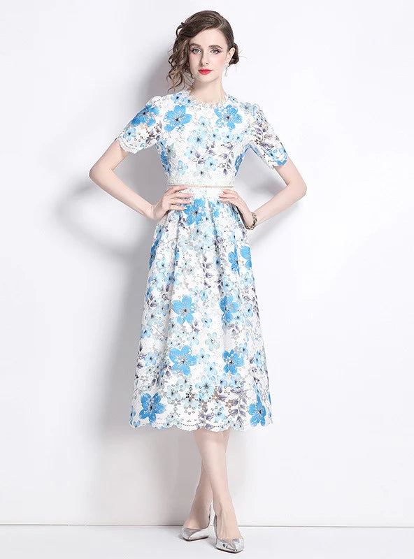 Happily enchanting captures the essence of this delightful blue floral dress. A symphony of light blue and white flowers cascades across the fabric, creating a vibrant yet serene aesthetic that's perfect for daytime events or casual outings. The dress boasts a flattering A-line silhouette that gently cinches at the waist with a delicate lace trim, promoting a sophisticated yet playful look. Crafted from a light, airy lace material, it offers both comfort and elegance, making it ideal for spring and summer weather. Whether attending a garden party or a weekend brunch, this dress ensures a chic, uplifting presence.