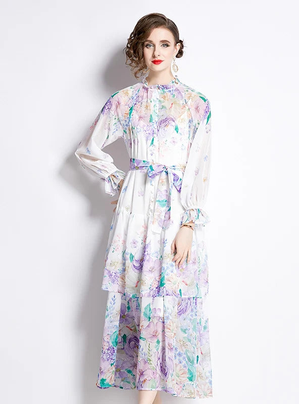 LONG-SLEEVED COLORFUL CAKE FLOWERS DRESS