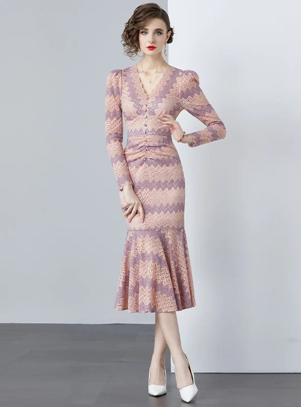 RETRO LONG-SLEEVED SLIM V-NECK DRESS