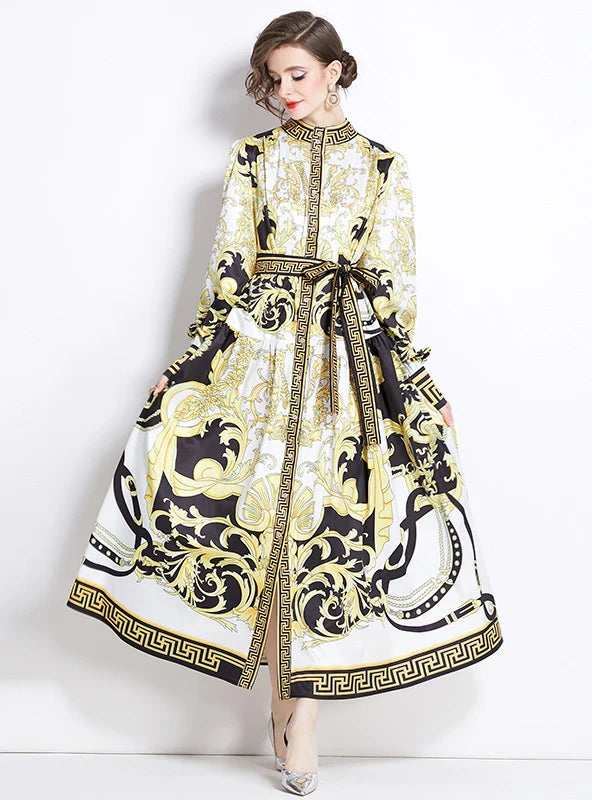 RETRO STAND-UP PRINTED LONG DRESS