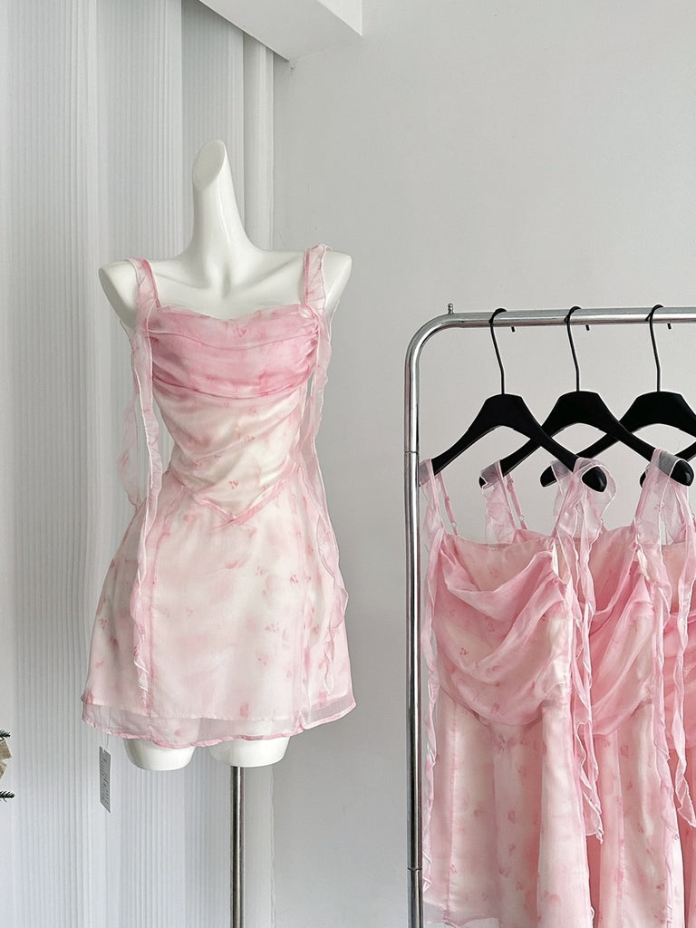 Ribbon-Tie Flared Skirt Pink Floral Dress