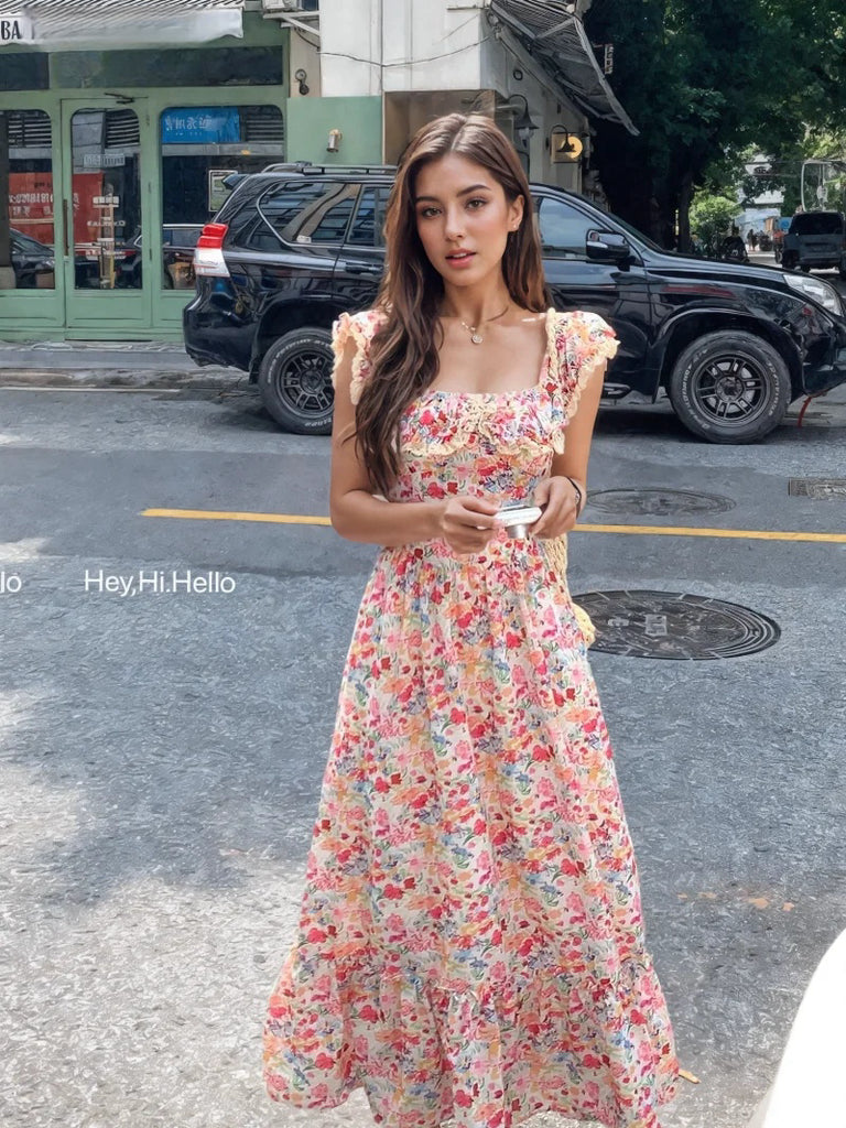 Wearing this beautiful floral dress is like stepping into a painting—its soft, flowing material drapes elegantly over your frame, creating a feminine silhouette. The ruffled sleeves and bodice detail add texture and depth, while the square neckline frames the face beautifully. The floral print features a variety of bright, happy colors that enhance your look without being overpowering. Perfect for daytime outings, summer strolls, or even a casual evening event, this dress offers versatility while being effortlessly stylish. The lightweight, breathable material ensures comfort, making it an ideal choice for long days that transition into magical nights.