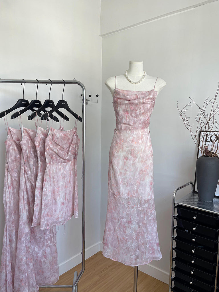 Spaghetti Straps Slim Silhouette Floral Pink Dress