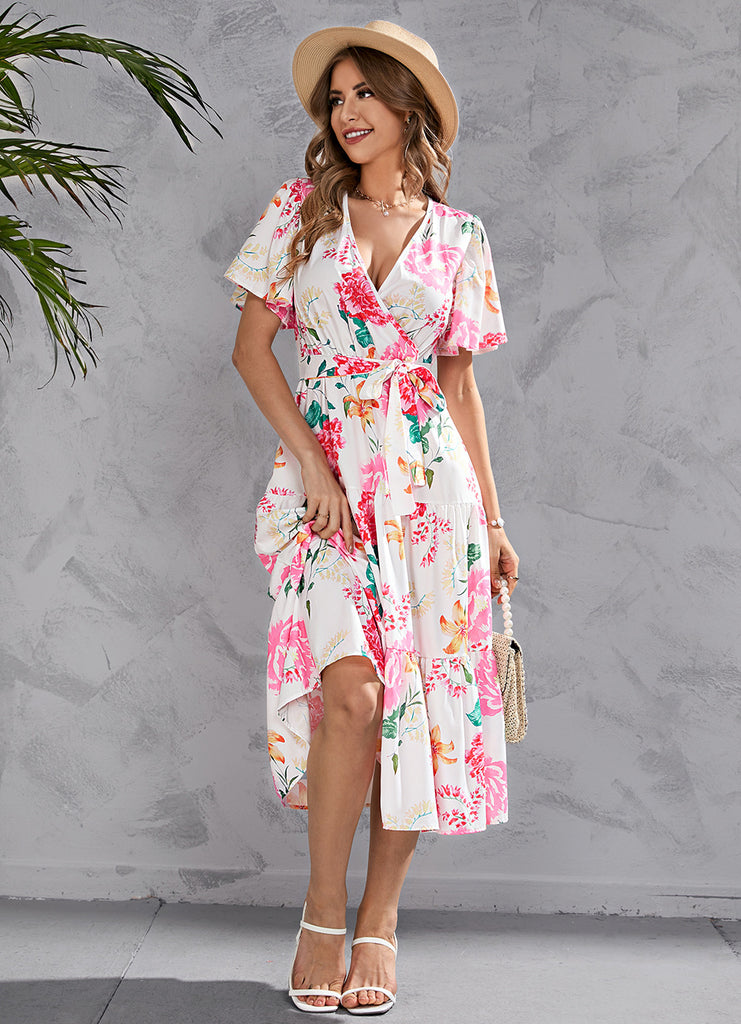 The New Women Fashion Woman's Summer Printed Floral V Neck Short Sleeve Dresses Belt Chiffon Mid Length Boho Beach Sundress