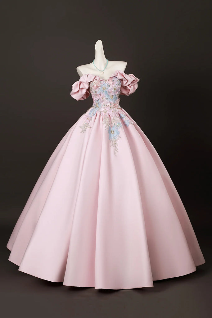 Pink Satin Lace A Line Off the Shoulder Appliques Prom Dress