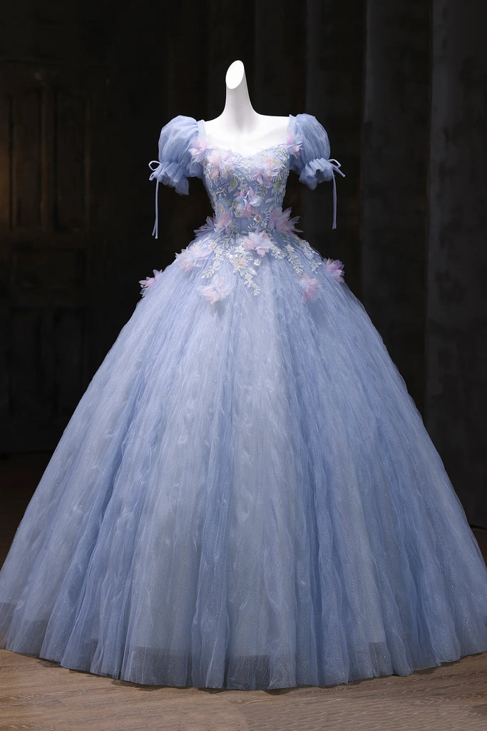 Short Sleeve Blue Tulle Sequins Flower Prom Dress
