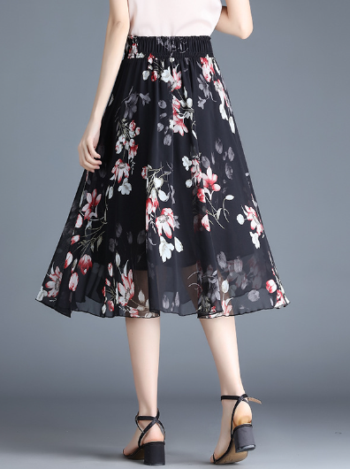 black print cute chiffon Joker floral long waist A-line skirt