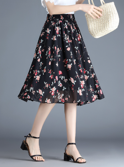 black print fashion chiffon Joker floral long waist A-line skirt