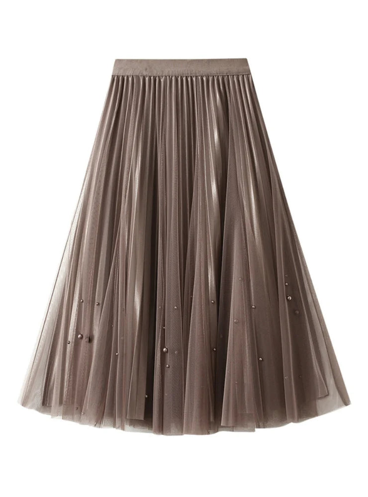 BEADED PLEATED SKIRT HIGH WAIST GAUZE SKIRT