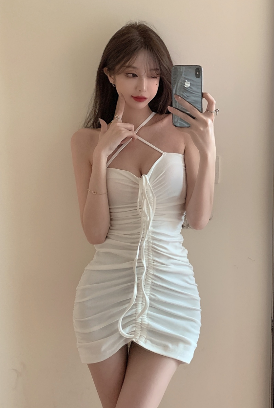 Sweet Lace-up Backless Strapless Drawstring Pleated Halte Dress