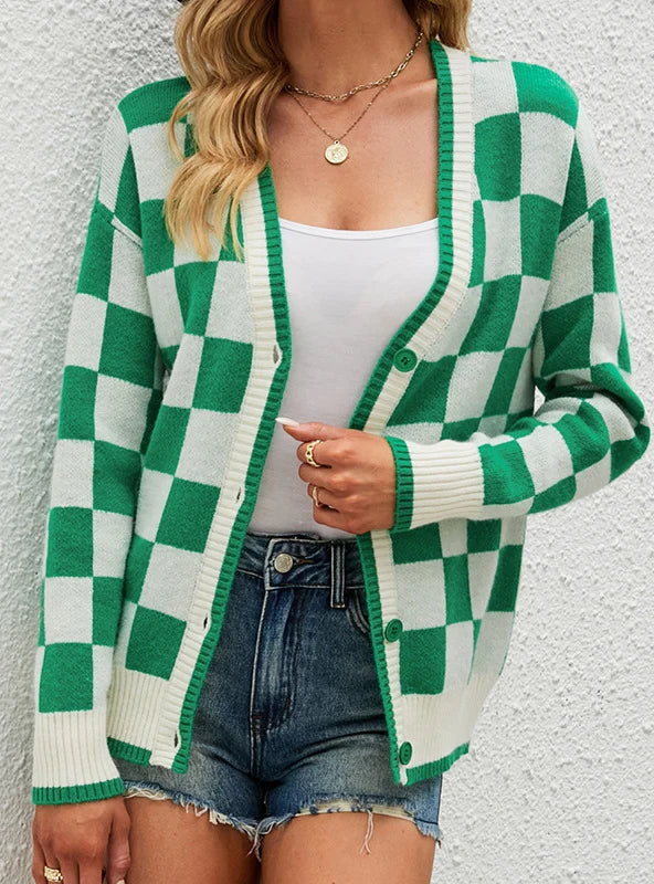 PLAID COLOR MATCHING CARDIGAN SWEATER