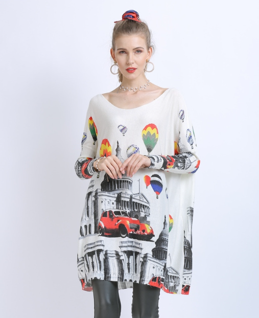 New Knitted Long Sleeve Loose Balloon Printed Sweater with I-neck