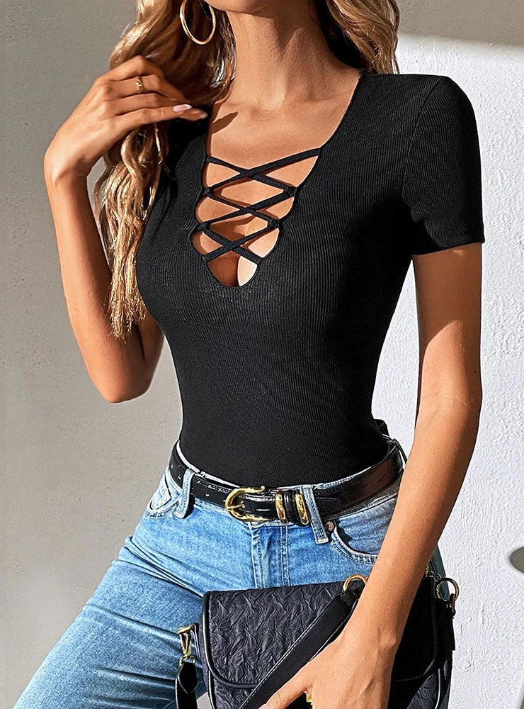 V-NECK HOLLOW SLIM SHORT SLEEVE T-SHIRT