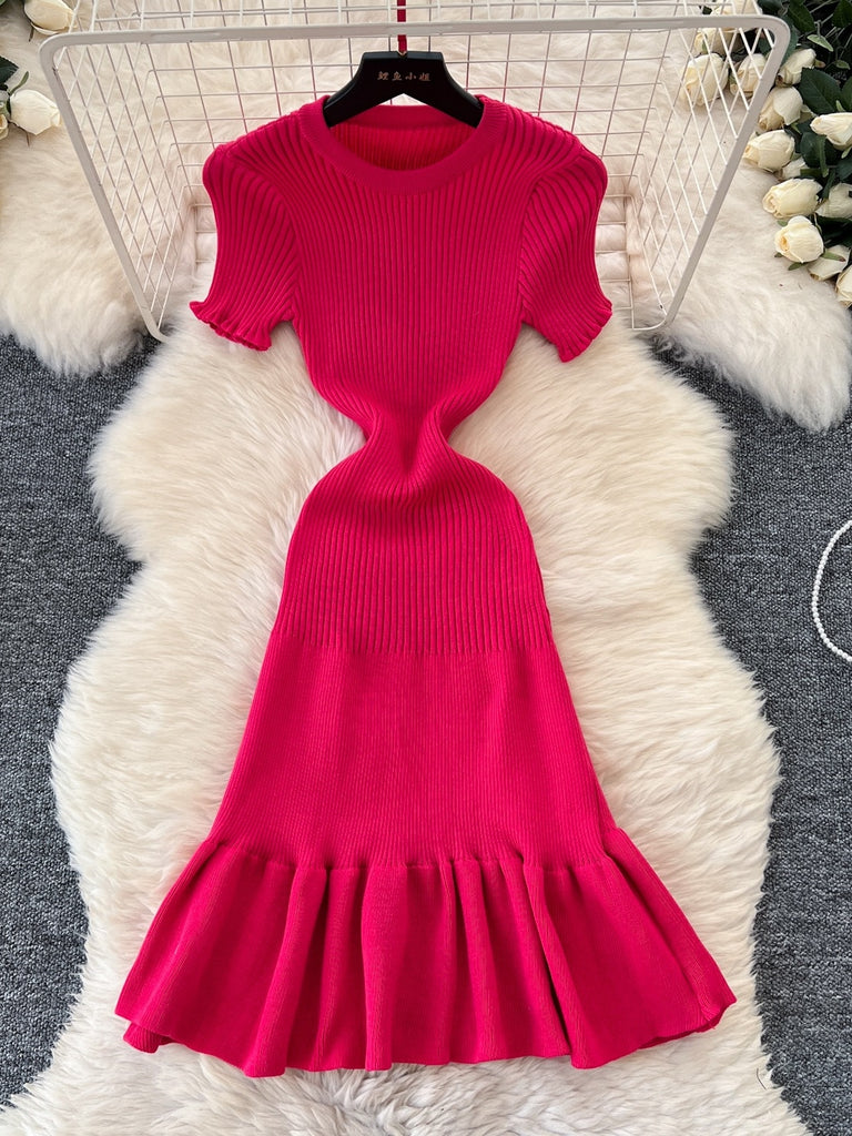 Embrace the vibrancy of this sanguine, hot pink dress that brings a splash of color to any wardrobe. Crafted from a stretchy knit fabric, it ensures a snug fit while accentuating your curves with its cinched waist and flared hem. The ribbed texture throughout adds depth and sophistication, making it a standout piece for both casual and formal settings. This dress features a modest round neckline and short sleeves, ideal for transitioning from day to night. The lightweight knit fabric is perfect for layering during cooler months or wearing alone during spring and summer, offering versatility and style in one stunning garment.