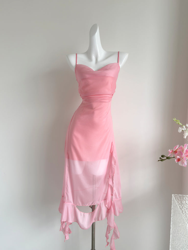 Chiffon Asymmetrical Skirt Pink Maxi Dress